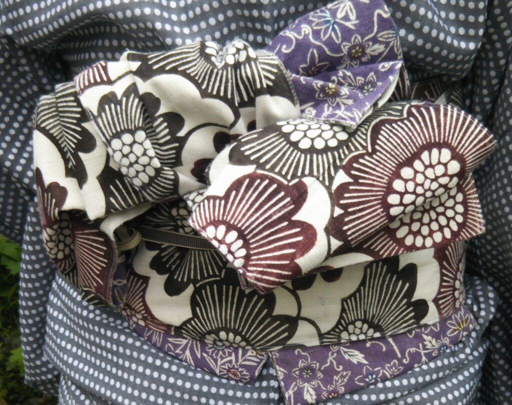 Obi musubi (obi tying style)-One of the charms of wearing a yukata is the obi (sash). Each person ties it in a slightly different way, and the knot itself becomes part of the design. Here is an example of an obi knot I learned directly from a kimono teacher — bold floral patterns creating a soft, sculptural shape at the back.