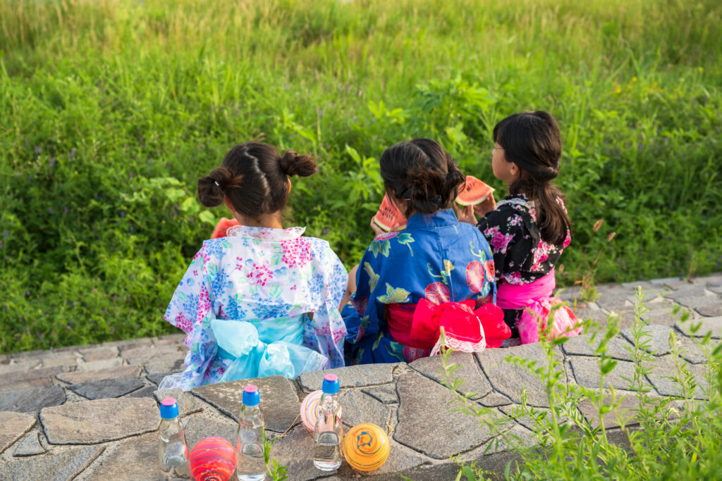 Children in yukata eating watermelon