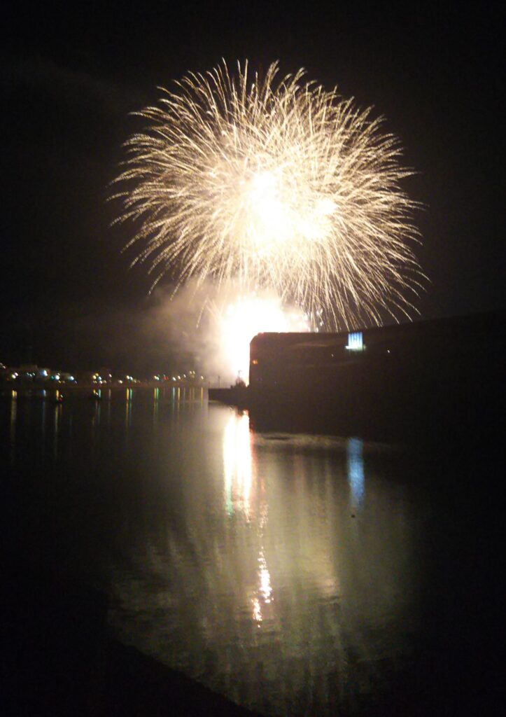 Fireworks reflected on the water — a rural summer night.