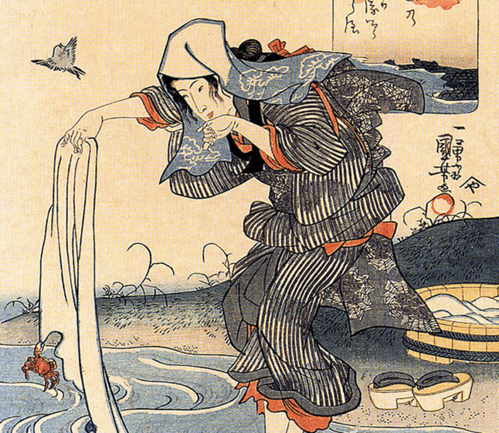 In ukiyo-e woodblock prints, yukata often appeared with tenugui hand towels — worn on the head, carried in hand, or used in daily life. These simple cloths are both practical and artistic.