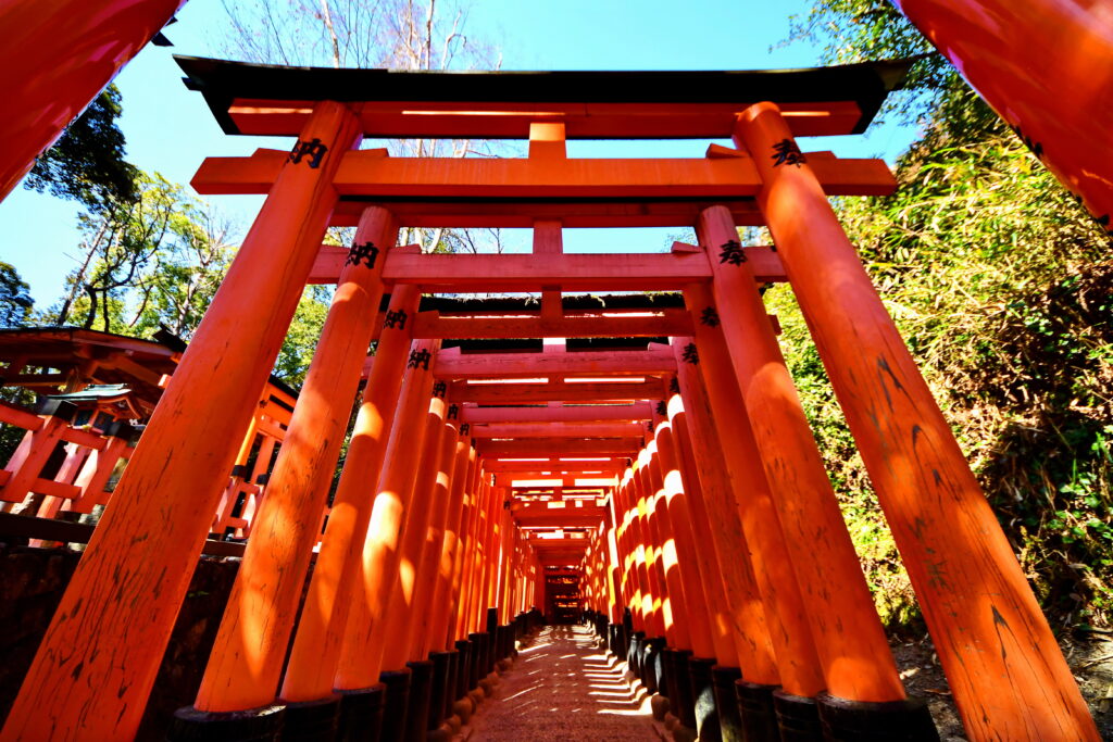 Vermilion torii gates symbolizing long-standing devotion to Inari faith and the continuity of nourishment and abundance.